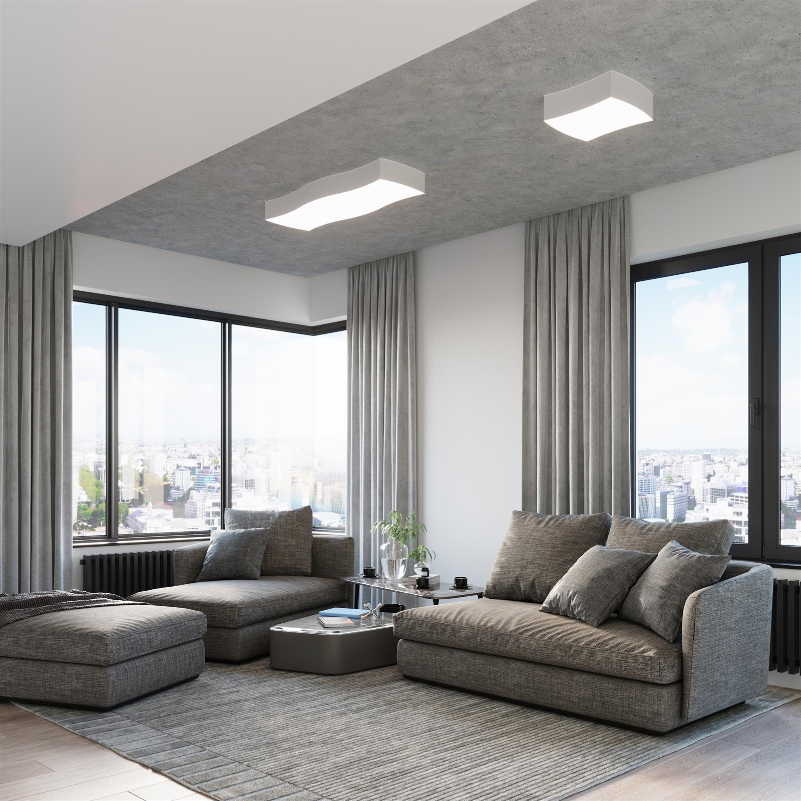 Łagodny kształt boków lampy układa się w delikatną falę, która kontrastuje z wyraziście zakończonymi rogami plafonu. Jednak mimo zestawienia tak pozornie odmiennych form, SQUARE zachwyca idealną spójnością wizualną, ciesząc oczy gości oraz domowników także za dnia.